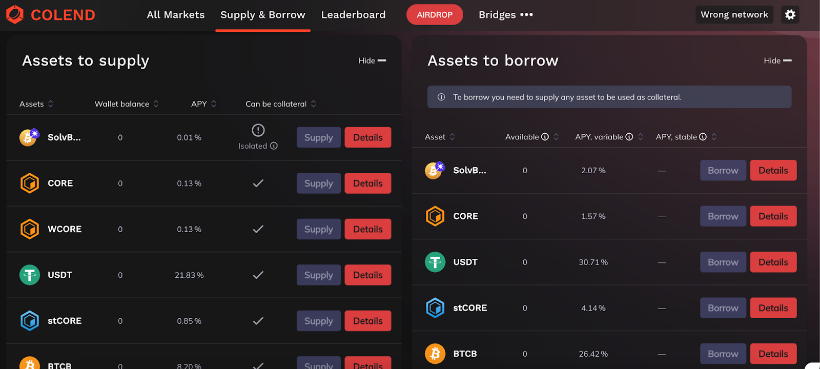 Now that you’re familiar with the Colend interface, let’s move on to connecting your wallet and supplying assets. → Connect and Supply