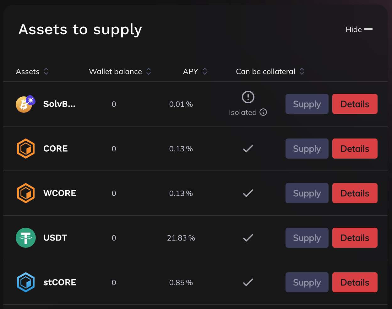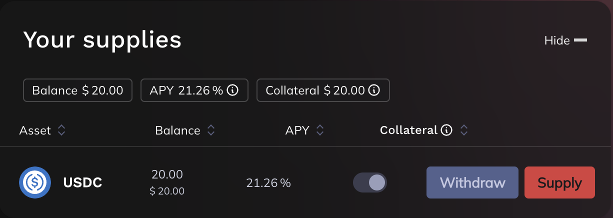 This section shows your balance, APYs, and whether an asset qualifies as collateral.