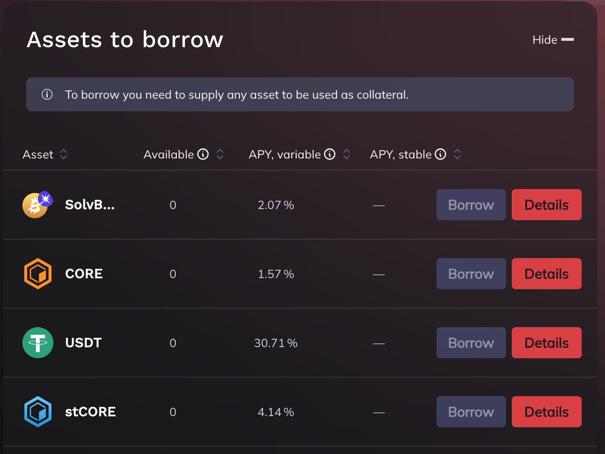 Here, you can see the borrowable assets and their rates (APY).