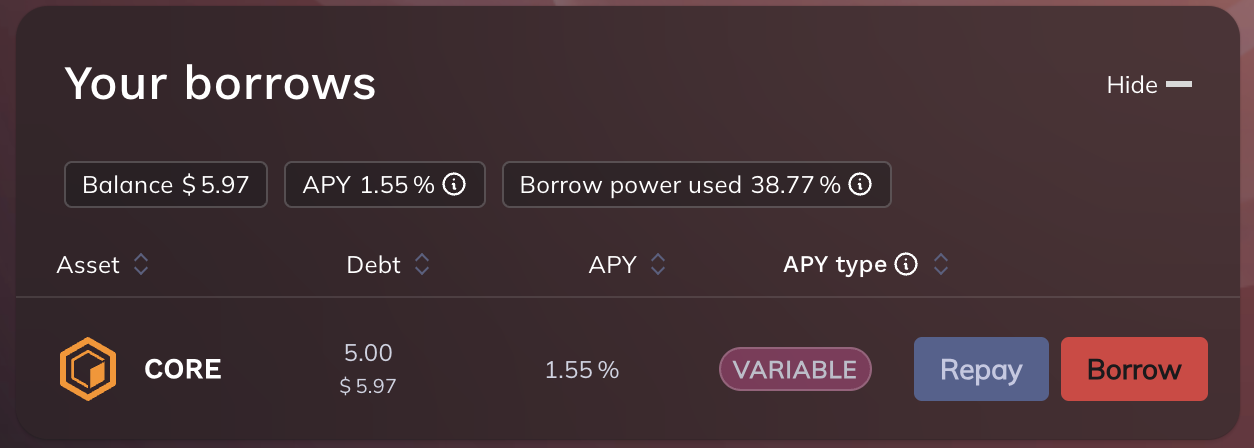 You can view your debt, the APY, and its type (variable or fixed). You can also see the Borrow Power you’ve used, which is proportional to the amount of collateral provided.